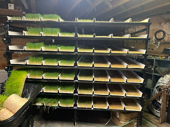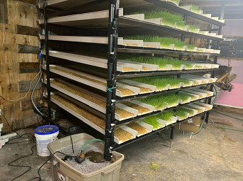 The fodder tray hydroponic system allows for fast germination and growth, producing fresh fodder every day at a low cost per pound.